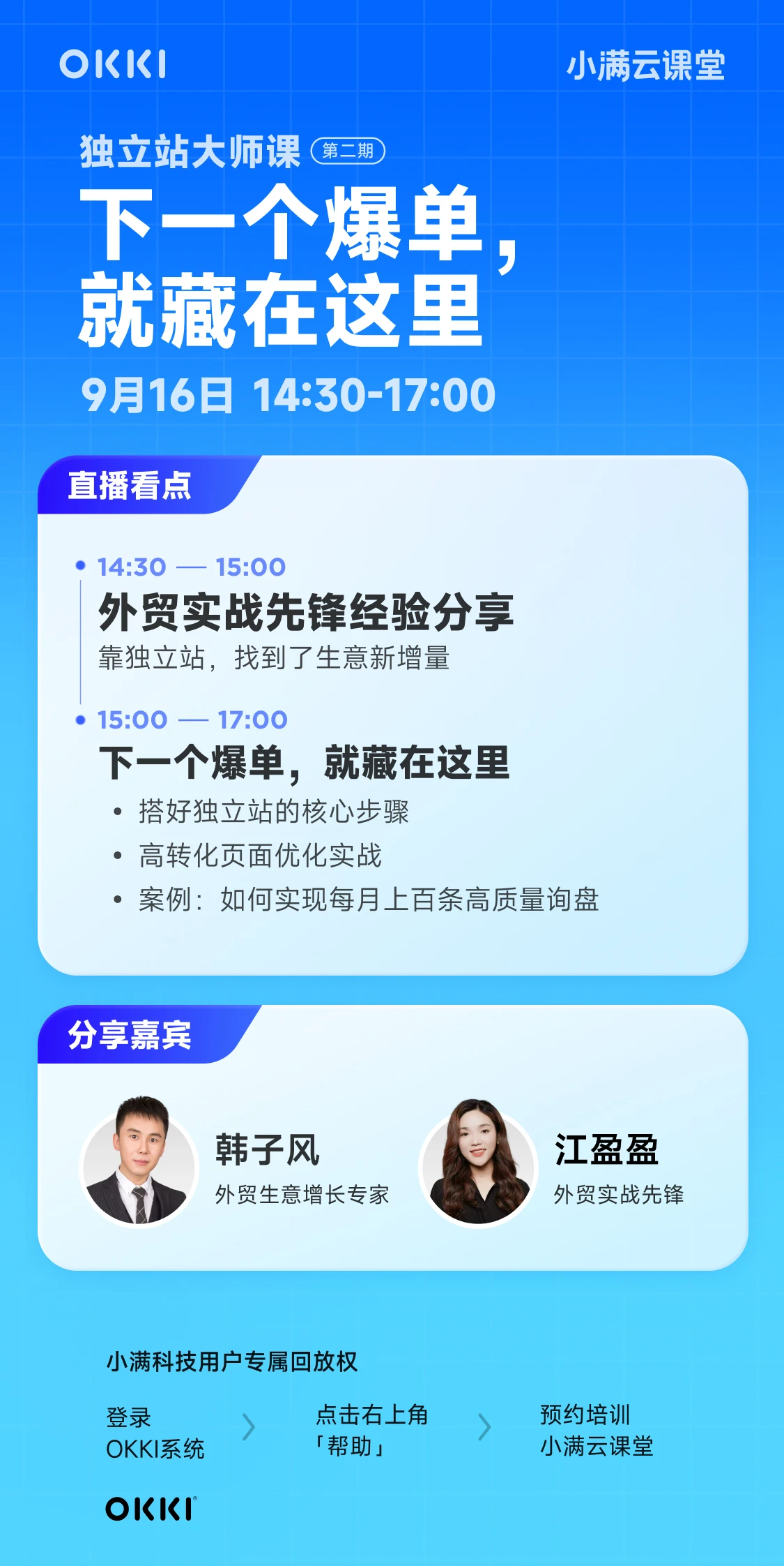 直播看点:14:30-15:00外贸实战先锋经验分享15:00-17:00《下一个爆单,就藏在这里》1、搭好独立站的核心步骤2、高转化页面优化实战3、案例:如何实现每月上百条高质量询盘