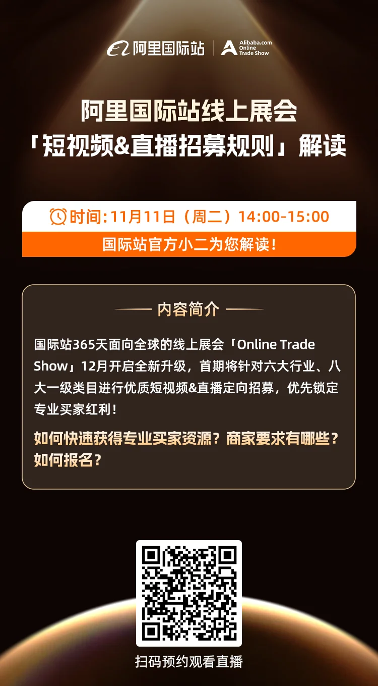 国际站365天面向全球的线上展会「Online Trade Show」12月开启全新升级,首期将针对六大行业、八大一级类目进行优质短视频&直播定向招募,优先锁定专业买家红利!