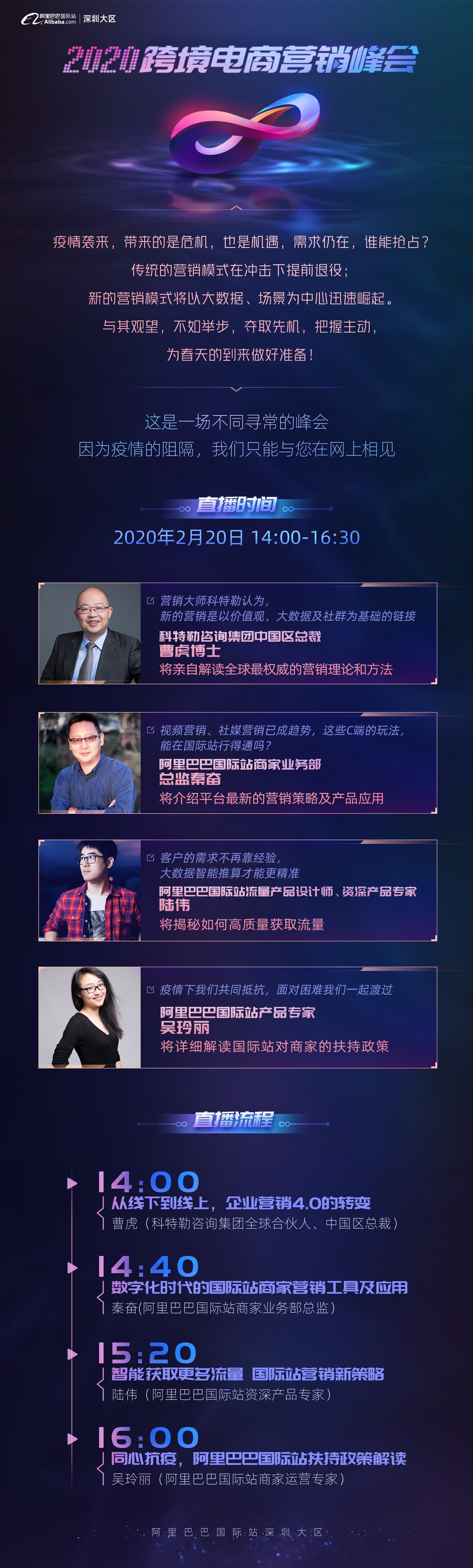 展会停了、海外拜访无法进行。疫情推动了企业营销模式的变革。在视频营销、社媒营销崛起的时代,中国企业如何抢占先机?本次邀请了著名营销专家、科特勒中国区总裁曹虎博士解读最新的营销理念。阿里巴巴国际站各位大咖也将解读国际站的营销趋势和产品,介绍如何获取更多优质流量。...