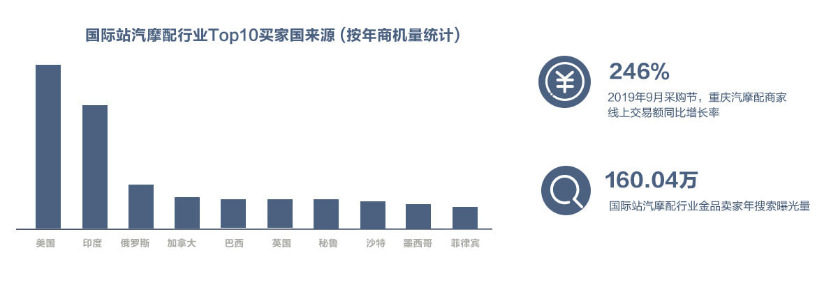 阿里巴巴国际站深入重庆汽摩产业发展链路,通过数字化外贸服务促进产业发展升级。2019年9月采购节大促期间,重庆汽摩行业线上交易额同比增长246%,数字化新外贸正为重庆传统的汽摩行业带来新的商机。