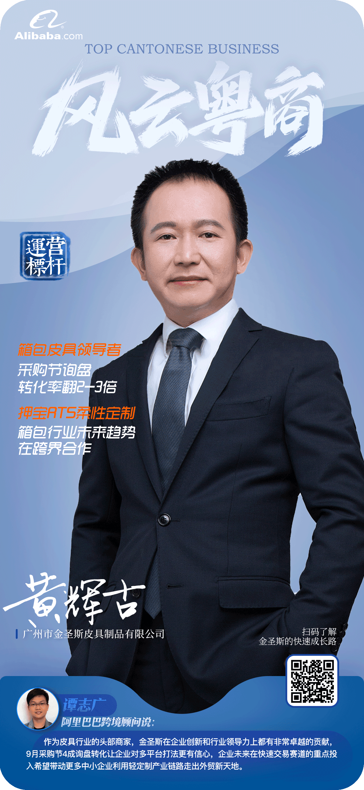 “广州花都是全国皮具的重点产业带,我们已经在布局行业的出海,采购节是其中重要的一环。” 国际贸易公司的网站有哪些?金圣斯的掌门人黄辉古一直以来,基本参与了国际贸易公司的网站——阿里巴巴国际站(Alibaba.com)有史以来的所有采购节。