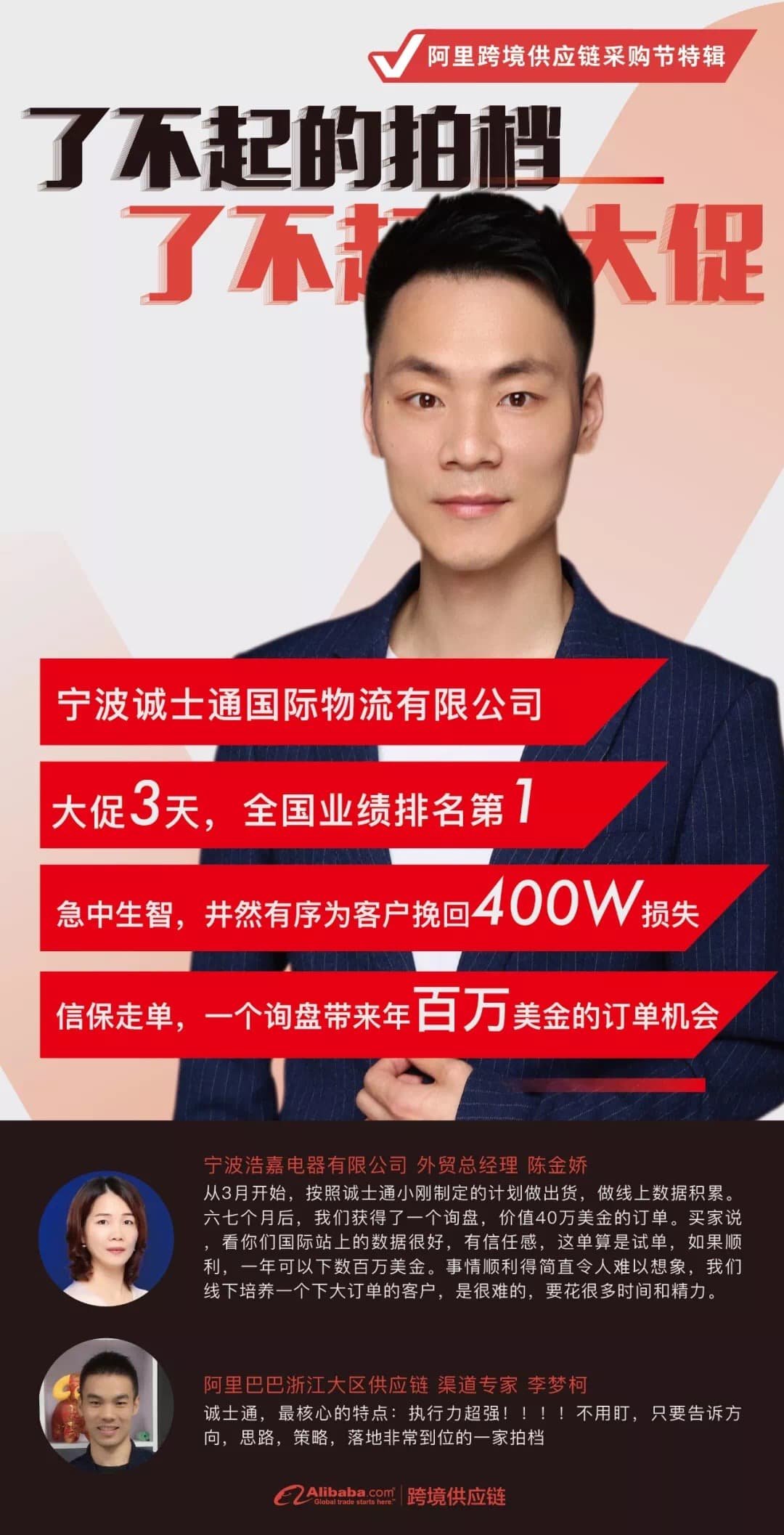 “做拍档近4年,个人成长很大,身边积累了很多客户朋友,视野开阔很多。现在,有团队,做的事情有价值,也能拿到一定回报。所以不会放弃,一直努力做下去。慈溪地区的这些客户既然开通了国际站,就是对国际站有期望,那么我们就好好服务这些客户,提供价值。”
