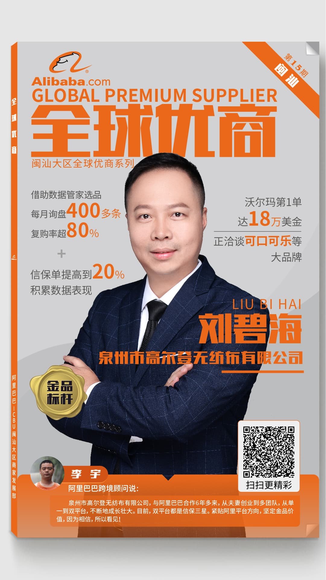 “泉州市高尔登无纺布有限公司,与阿里巴巴合作6年多来,从夫妻创业到多团队,从单一到双平台,不断地成长壮大。目前,双平台都是信保三星。紧贴阿里平台方向,坚定金品价值,因为相信,所以看见!”