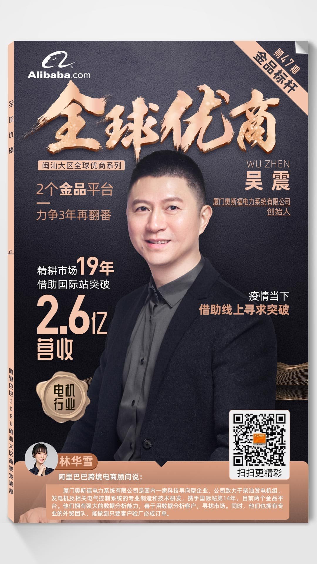“厦门奥斯福电力系统有限公司是国内一家科技导向型企业,公司致力于柴油发电机组、发电机及相关电气控制系统的专业制造和技术研发,携手外贸b2b网站阿里巴巴国际站第14年,目前两个金品平台。他们拥有强大的数据分析能力,善于用数据分析客户,寻找市场。同时,他们也拥有专业的外贸团队,能做到只要客户验厂必成订单。”