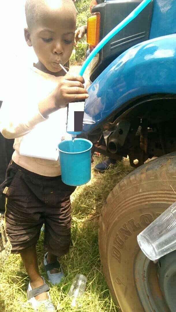 非洲男孩KEN,抢到水桶,沿着红色桶边,大口大口地把井水灌入嘴里。