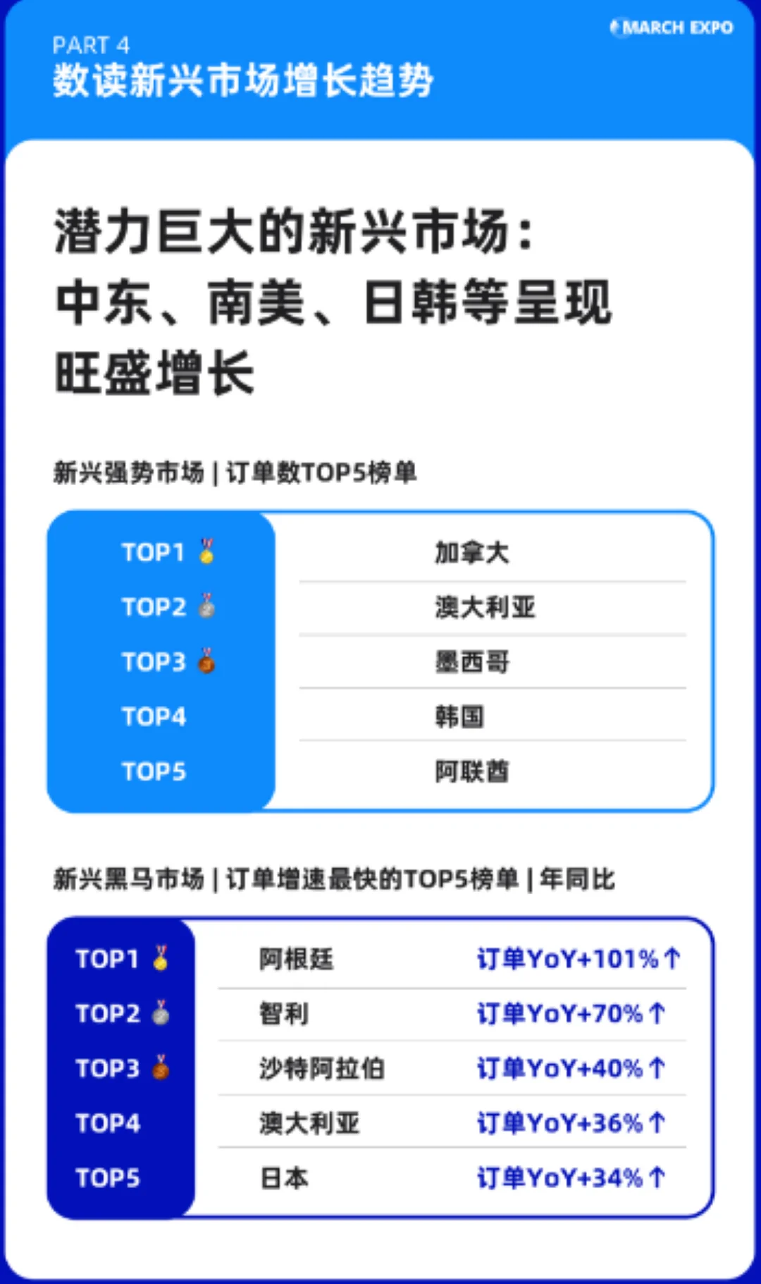 随着全球贸易格局变化,新兴市场正成为外贸增长新引擎。在阿里巴巴国际站平台上,中东、南美、亚太等市场增速创下新高。 以沙特为例,今年有义乌外贸商家通过阿里国际站接到2000多万美元的中东大单。全球市场呈现出多元化增长态势,加拿大、澳大利亚、墨西哥、韩国、阿联酋位列订单数TOP5国家。而订单增速榜上,阿根廷同比增长超101%,智利超70%,沙特超40%。
