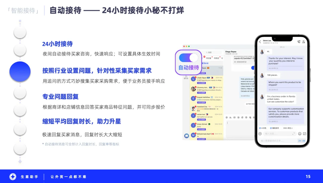平台的 “智能接待” 功能可 7×24 小时响应采购商咨询,通过模拟真实业务员的沟通逻辑,自动解答产品参数、定制流程等常见问题。上海某机械企业曾通过 AI 助手在深夜接待沙特买家,经过 5 轮专业对话后成功锁定 196 万美元意向订单。这种即时响应能力,使商家即使在非工作时间也能抓住商机。