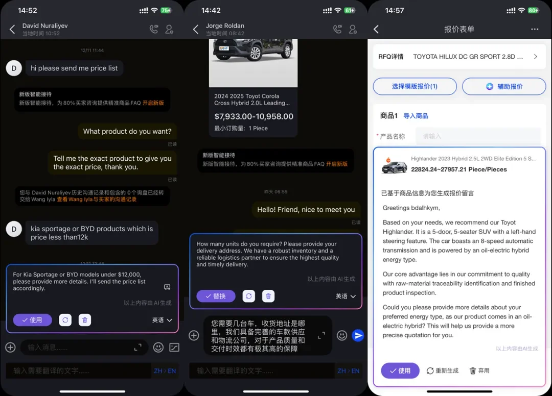 有了这一系列的操作,即便是凌晨发来的询盘,智能接待还能提供报价。等业务员早上上班,客户的基础需求、沟通路径都清晰地呈现给业务员,“省去了很大一部分工作量”。