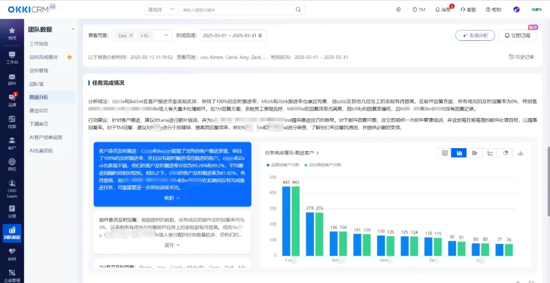 “比如,以前每次和客户聊完,我们会用表格和人工的方式记录进展,每周开一次周会,大家讨论一下客户的情况。但OKKI能在一秒钟内,总结出客户成交转化情况、团队成员的客户跟进效率等等,并分析接下来该如何调整团队目标,给到切实可行的建议。而且,AI的分析会比人工更深入和详细”。
