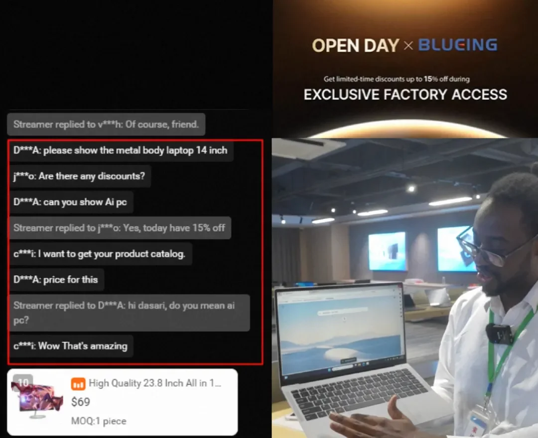 索沃思的Openday直播,在讲到AI PC平板电脑时,直播间买家十分激动,纷纷留言:"Can you show me AI PC, may I know more price details"" Wow, that's amazing"。通过实时互动数据,商家可以更精准地测算需求,避免传统出海“烧钱打水漂”。