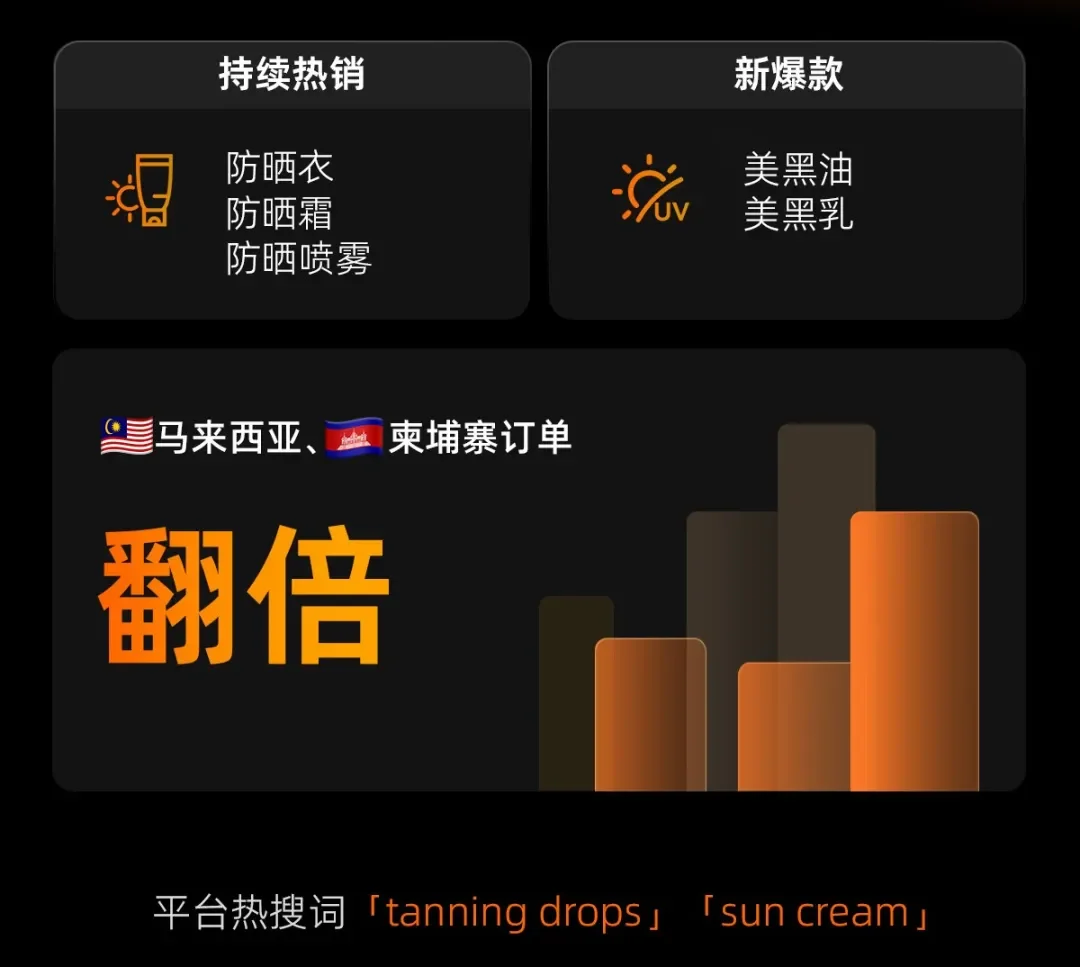 这个夏天,有人怕晒伤,有人偏要晒出健康焦糖色。“防晒”与“美黑”两条需求线齐飞,双双带动爆单。