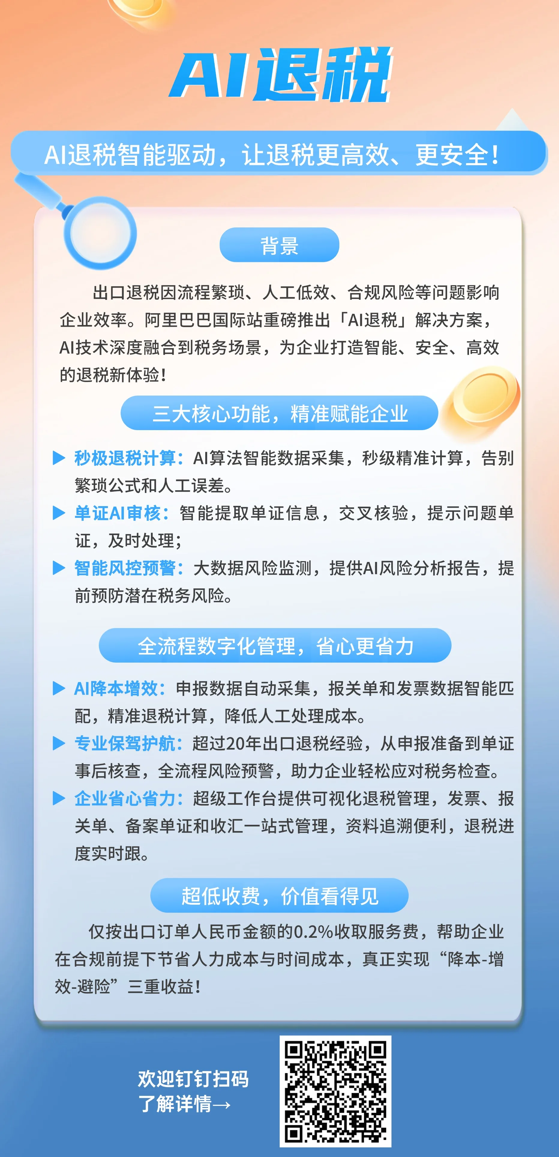 《征求意见稿》中出口退税部分的新变化对企业提出了更高的挑战,但同时也为合规经营的企业带来了新的发展机遇。借助阿里国际站「AI退税」等专业工具,企业能够更好地适应监管导向,提升出口退税管理水平,阿里国际站「AI退税」作为专注于跨境电商的出口退税服务,积极响应国家政策,为企业提供更加便捷、高效、安全的退税服务。