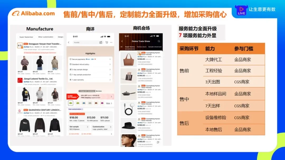 当前,买家正在变得挑剔,他们对发货时效、品质保障等服务的关注,已从下游消费市场穿透到了上游B端市场。我们常说,“现货是钩子,小单是路子,大单是果子”,今年,我们也升级了现货、定制等一系列标准化的服务能力,帮助商家更好地拿到大订单。