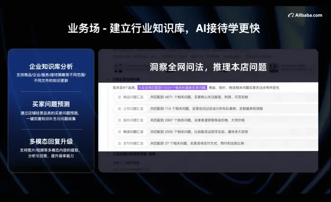 如图中的案例,这个商家所在的行业,买家最关注的核心问题有10024个,基于这些问题和商家提供企业知识库,以及商品内容,AI会帮助商家去生成针对这些核心问题的最优回答。