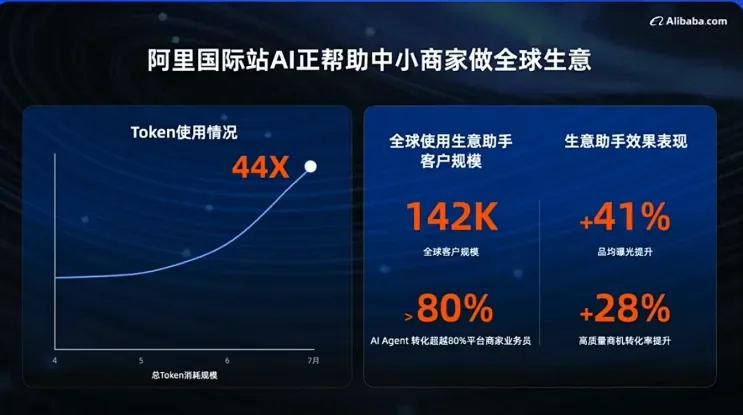 过去这一年,阿里国际站推出了生意助手的4个Agent产品。用户规模,包含中外商家,每周使用AI Agent产品的活跃商家超过14.2万。这个AI生意助手,看发布商品的品均曝光、接待询盘带来的转化率,已经超越80%的真人业务员水平。它已经可以帮助到国际站的新商家,起步就能达到了一个比较高的水准。