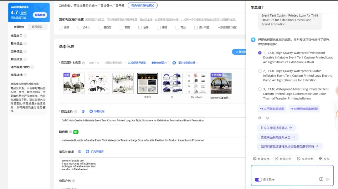 而现在,发品时间被缩短到只有几分钟——只需输入关键词和商品信息,AI生意助手的标题优化的能力,就可以根据买家搜索的侧重点,找到“买家关注啥”融入标题。并且,AI生意助手还会根据店铺的历史交易信息和服务能力,挖掘更深层次的卖点。比如,“高品质防水充气帐篷”这一标题,经过它的加工,就加入了“快速设置”“蜘蛛形状”“户外活动广告”“可定制”等描述。