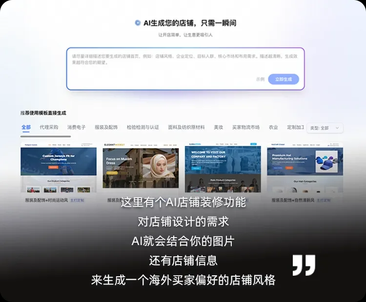 但就在前不久,阿里国际站上线了「AI店铺装修」功能,影视飓风率先尝到甜头!只需输入设计需求或选择高转化模板,最快2分钟,就能用AI帮你快速、低成本生成专业级、高转化的全球店铺。