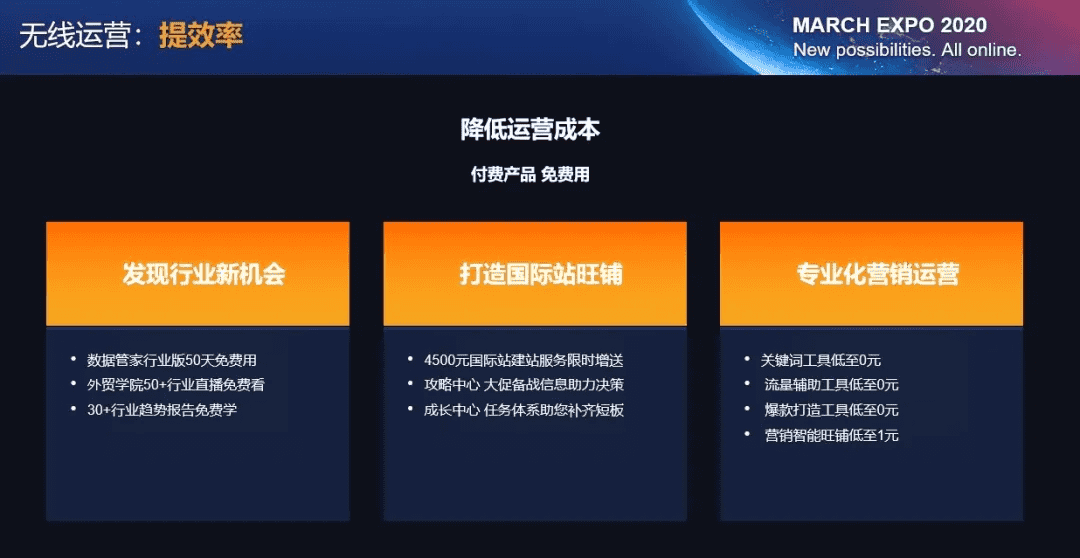 整个三月新贸节期间,商家都可以免费领取数据管家行业版的使用权限,越早领取越早享受数据化运营的红利,国际站还将限时赠送价值 4500元的建站服务,并在商家攻略中心实时更新海量的大促备战信息,助力商家决策。外贸服务市场则联合广大生态服务商,为商机提供专业化营销运营辅助,关键词工具低至0元,流量辅助工具低至0元,爆款打造工具低至0元,营销智能旺铺低至1元。
