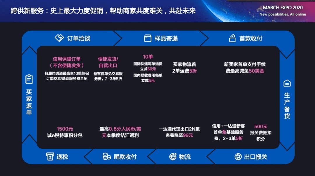 确定性之外,围绕着商家的业务全链路,三月新贸节期间,阿里巴巴跨境供应链推出“史上最大促销力度”的跨供新服务: