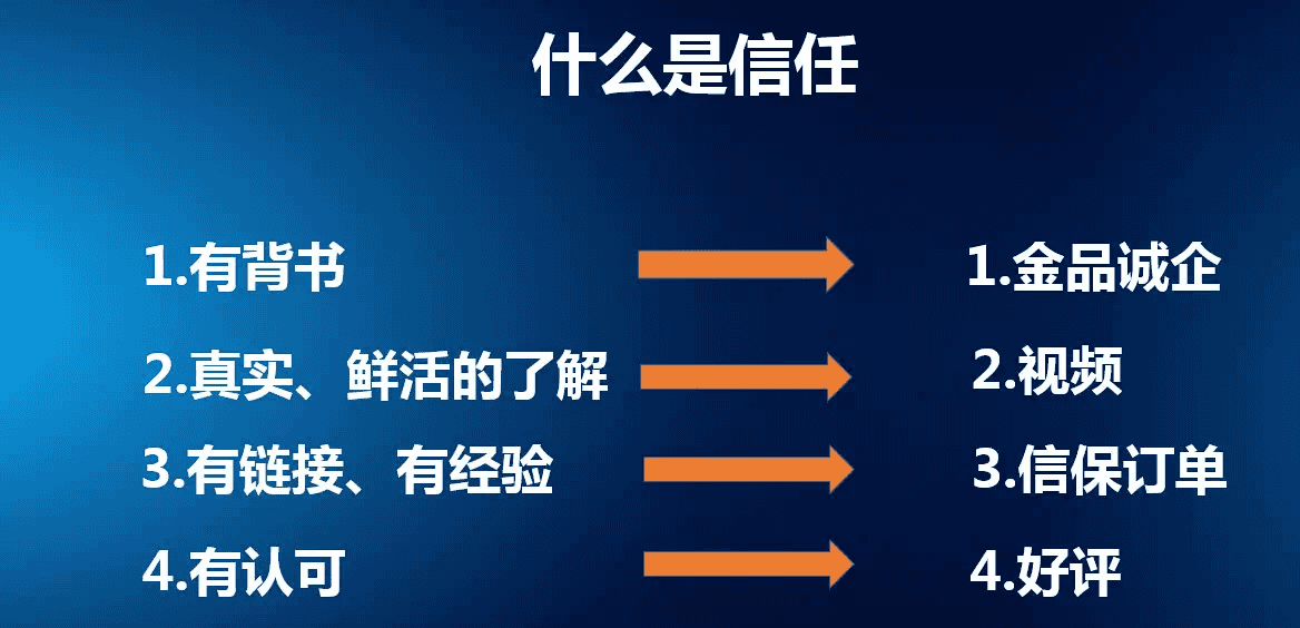 其中,可以通过国际b2b电子商务平台阿里国际站金品诚企解决背书问题;通过短视频解决了解问题;通过信用保障订单解决经验问题;通过买家的好评,解决认可问题。