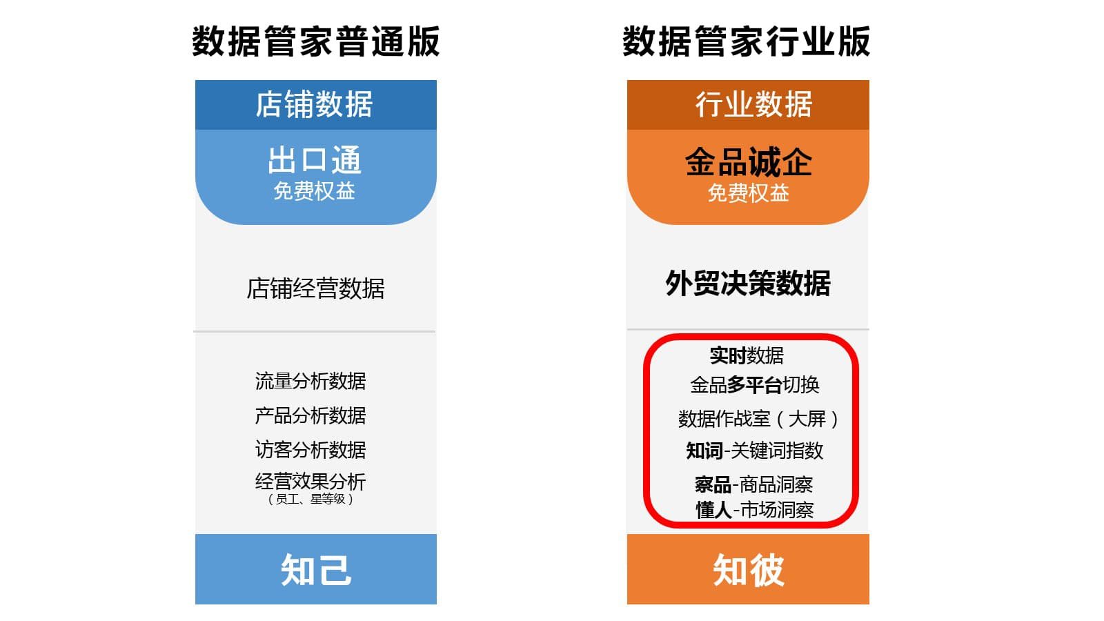 数据管家行业版由原数据管家企业版升级而来,除了具有普通版数据管家的基础功能外,还基于阿里巴巴国际站独有买家行为数据及行业数据洞察,重磅推出词、品、人3大核心功能,提供一站式选词、选品、洞察客户的数据服务,助力外贸订单起飞。