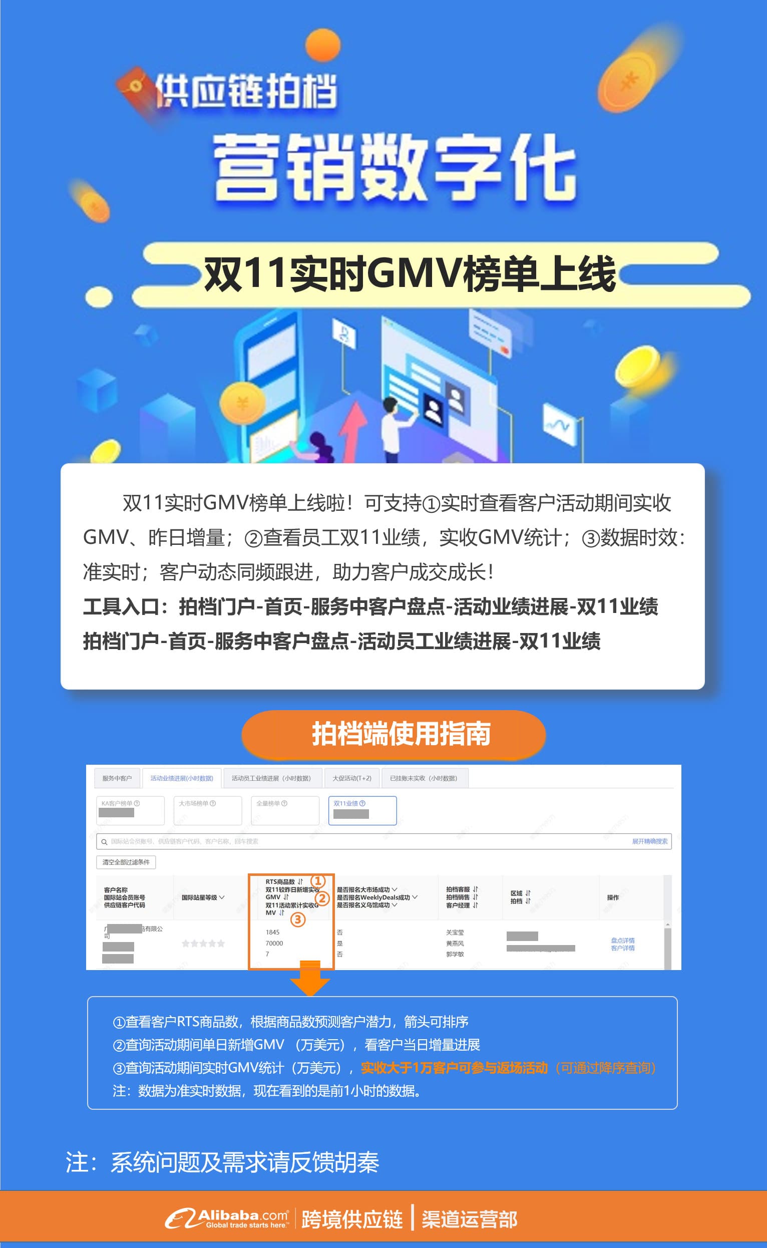 ③数据时效:准实时;客户动态同频跟进,助力客户成交成长!工具入口:拍档门户-首页-服务中客户盘点-活动业绩进展-双11业绩拍档门户-首页-服务中客户盘点-活动员工业绩进展-双11业绩