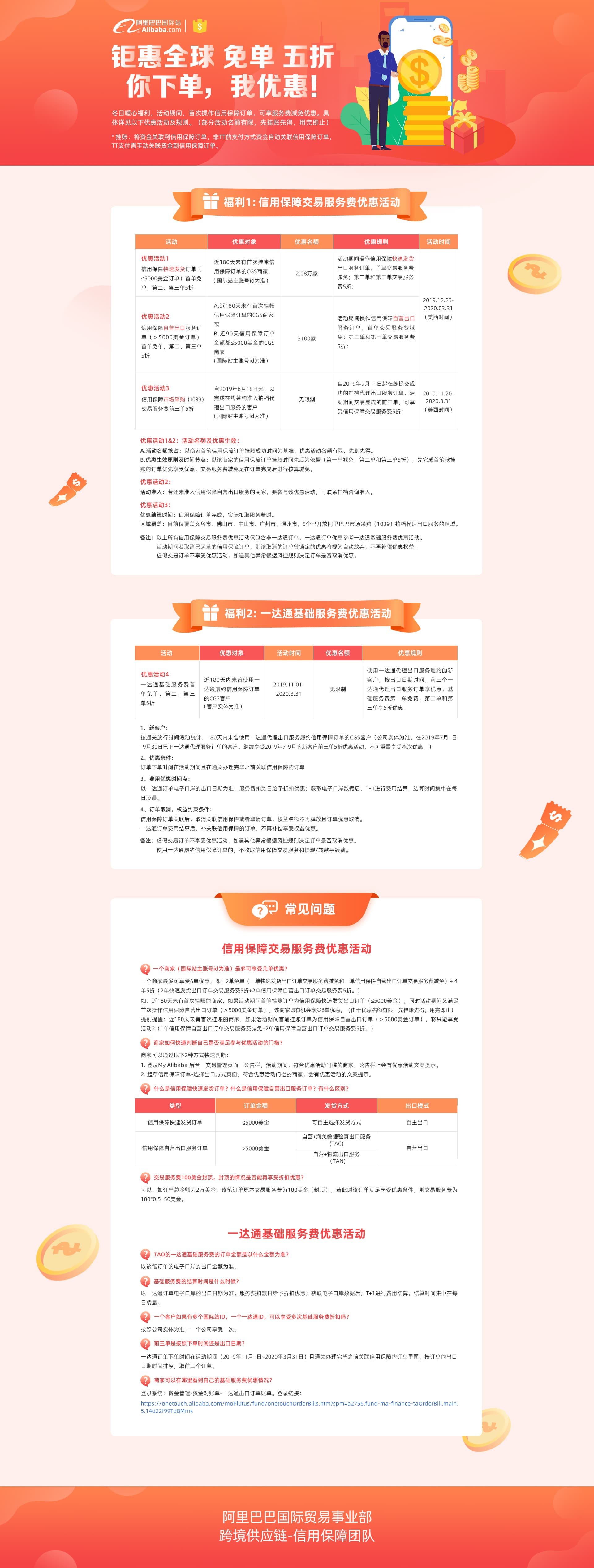冬日暖心福利:你下单,我优惠!阿里巴巴国际站的商家朋友们,信用保障年终钜惠,服务费免单/5折啦!活动期间,首次操作信用保障订单,有机会享受交易服务费首单免费,第2、3单5折优惠。活动名额有限,根据信用保障订单首笔款挂账的时间先后为依据,先挂账先得优惠。优惠活动详细可咨询销售经理或拍档,或点击此链接了解:https://supplier.alibaba.com/gw_xb快来抢优惠吧!